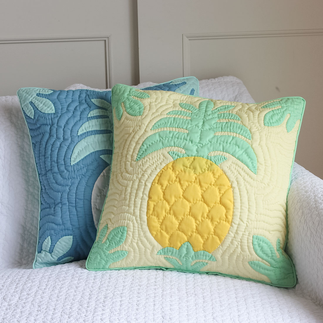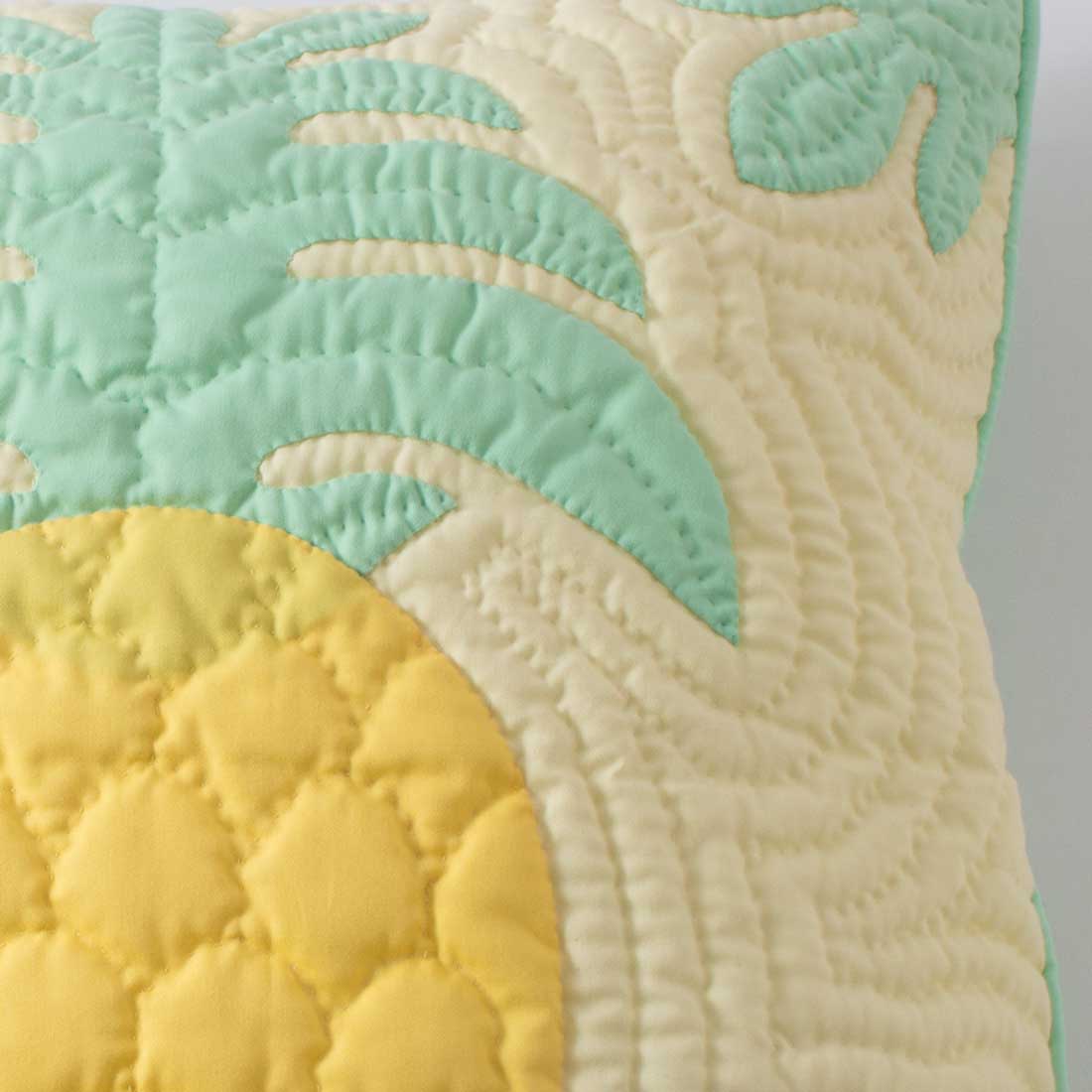 ちょっとひっくり返して使ってみた時も、さりげなくインテリアに溶け込むようこだわって製作されたハワイアンキルトです。