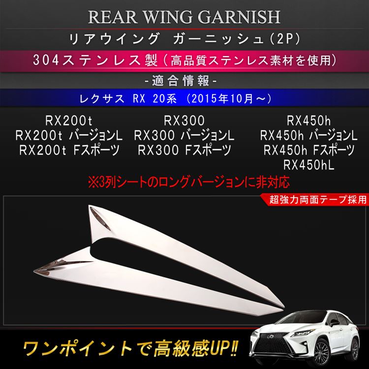 商品名 レクサス RX 20系 リアウイング ガーニッシュ 適合車種 レクサス RX(LEXUS RX) 【年式:2015年10月(平成27年10月) 〜】 RX200t RX200t バージョンL RX200t Fスポーツ RX300 RX300 バージョンL RX300 Fスポーツ RX450h RX450h バージョンL RX450h Fスポーツ RX450h L ※3列シートのロングバージョンに適合しません。