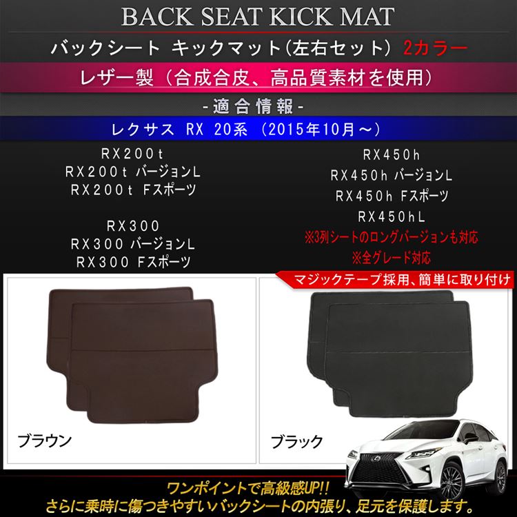 商品名 レクサス RX 20系 バックシート キックガード 適合車種 レクサス RX(LEXUS RX) 【年式:2015年10月(平成27年10月) 〜】 RX200t RX200t バージョンL RX200t Fスポーツ RX300 RX300 バージョンL RX300 Fスポーツ RX450h RX450h バージョンL RX450h Fスポーツ RX450h L ※3列シートのロングバージョンにも適合します。