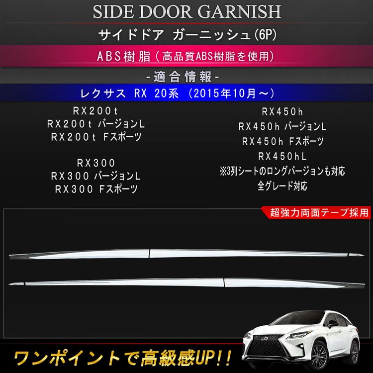商品名 レクサス RX 20系 サイドドアガーニッシュ 適合車種 レクサス RX(LEXUS RX) 【年式:2015年10月(平成27年10月) 〜】 RX200t RX200 バージョンL RX200 Fスポーツ RX300 RX300 バージョンL RX300 Fスポーツ RX450 RX450 バージョンL RX450 Fスポーツ RX450 L 3列シートのロングバージョンも対応 ※全グレード対応 素材 ABS樹脂 カラー 鏡面メッキ上げ パーツ数 6 商品説明 ★