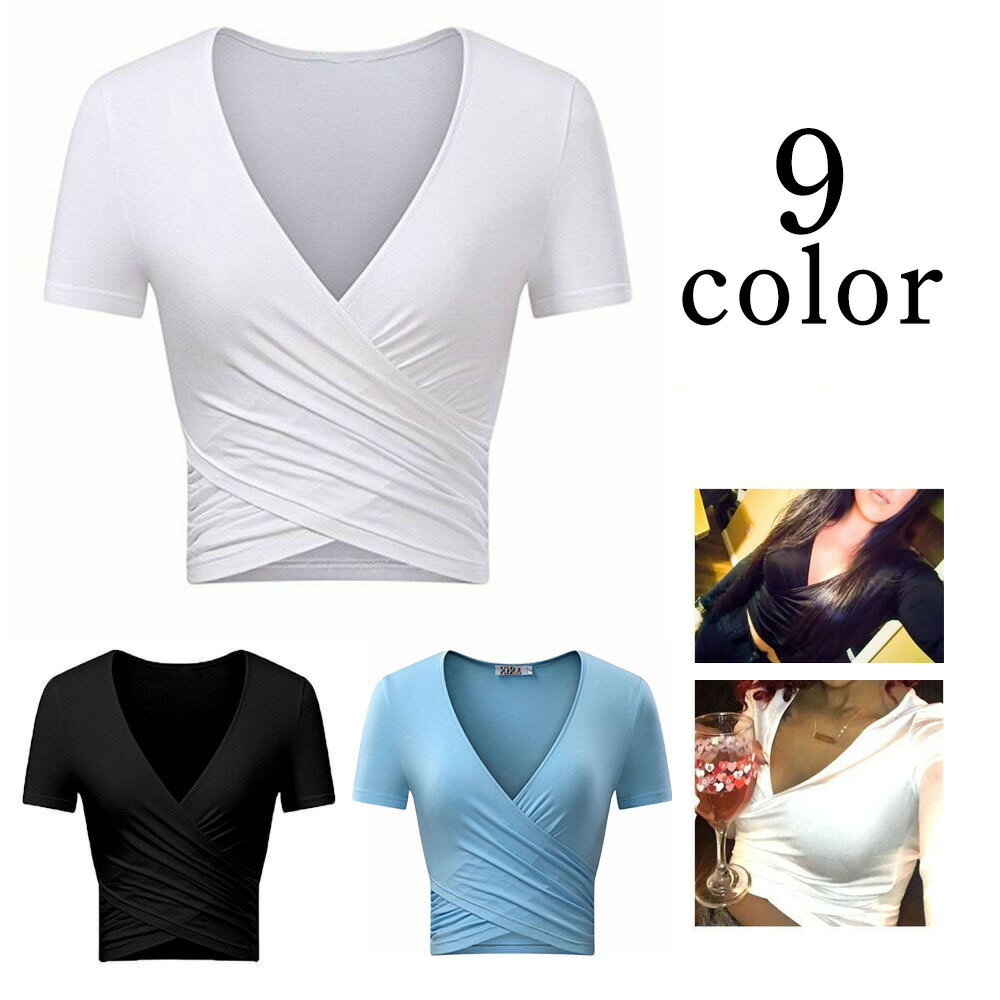 送料無料Tシャツ 半袖 深Vネック プランジングネック ショート丈 セクシー レディース トップス カットソー クロスデザイン タイト スリム 春 夏 シンプル 無地 単色 ソリッドカラー SEXY 女性用 婦人用 S M L XL