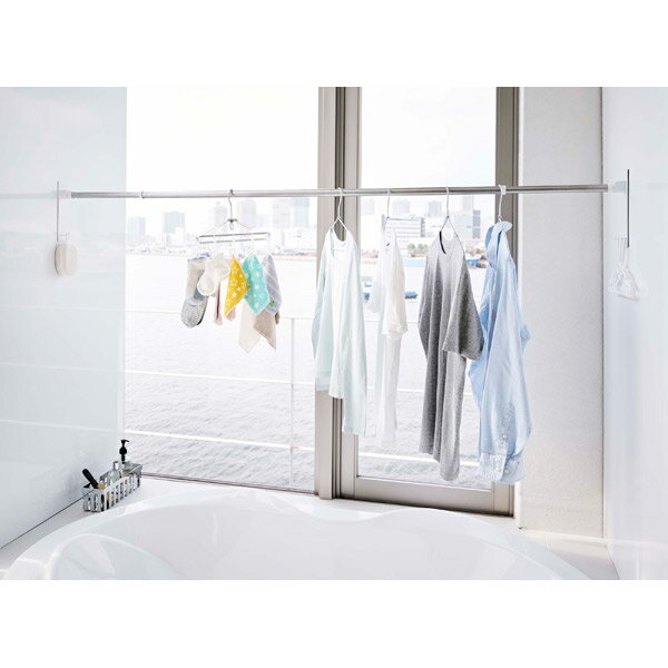 浴室の好な位置に簡単取り付けできる便利なフック付きの物干し竿ホルダー。
