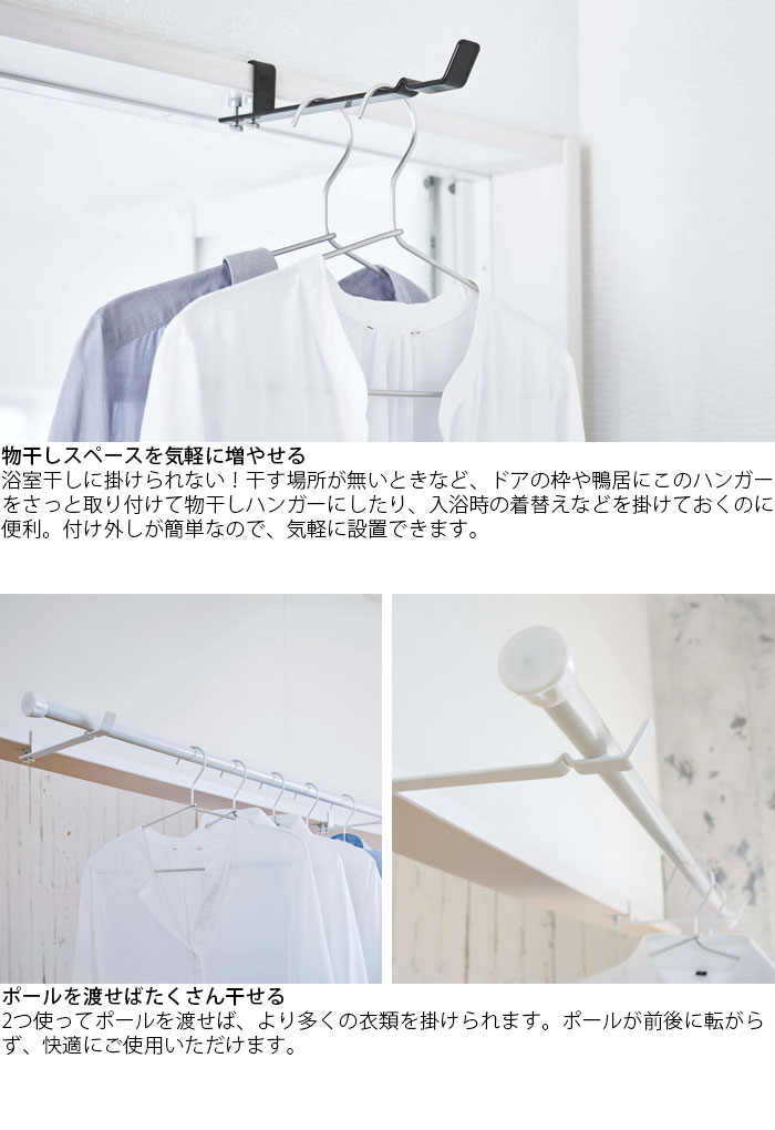 商品説明商品詳細 バスルームの扉やドア、リビングのかもいに掛けるだけで便利な室内ハンガーに早変わり。