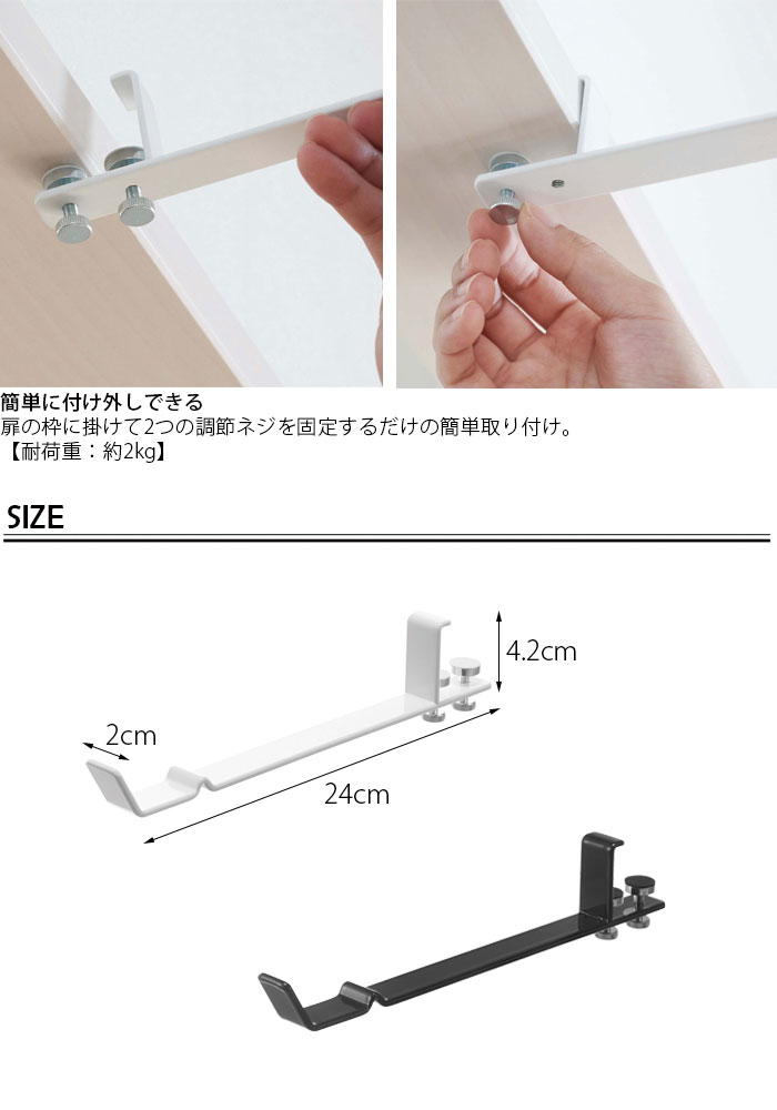 サイズ 約 幅2 × 奥行24 × 高さ4.2 cm [内寸サイズ]ハンガー部奥行:約 17.5 cm材質 本体:スチール(粉体塗装)重量 約 160 g 耐荷重約 2 kg備考[対応サイズ]枠・かもいの厚み:約 15 〜 30 mm 枠・かもいの引っ掛け部分:約 8mm 以上 室内物干し竿:直径 約 35 mm 以下 ※長さ約1.8mまでの竿をご使用ください。